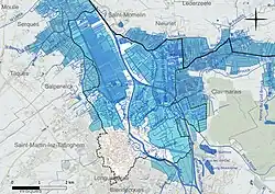 L'occupation des sols de la commune, telle qu'elle ressort de la base de données européenne d’occupation biophysique des sols Corine Land Cover (CLC), est marquée par l'importance des territoires agricoles (62,8 % en 2018), une proportion sensiblement équivalente à celle de 1990 (63,4 %). La répartition détaillée en 2018 est la suivante : zones agricoles hétérogènes (47,3 %), zones urbanisées (23 %), zones humides intérieures (10,5 %), terres arables (9,7 %), prairies (5,8 %), zones industrielles ou commerciales et réseaux de communication (2,4 %), espaces verts artificialisés, non agricoles (1,3 %)[25]. L'évolution de l’occupation des sols de la commune et de ses infrastructures peut être observée sur les différentes représentations cartographiques du territoire : la carte de Cassini (XVIIIe siècle), la carte d'état-major (1820-1866) et les cartes ou photos aériennes de l'IGN pour la période actuelle (depuis 1950)[Carte 1].