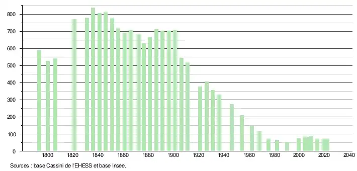 L'évolution du nombre d'habitants est connue à travers les recensements de la population effectués dans la commune depuis 1793. Pour les communes de moins de 10 000 habitants, une enquête de recensement portant sur toute la population est réalisée tous les cinq ans, les populations de référence des années intermédiaires étant quant à elles estimées par interpolation ou extrapolation[21]. Pour la commune, le premier recensement exhaustif entrant dans le cadre du nouveau dispositif a été réalisé en 2004[22].