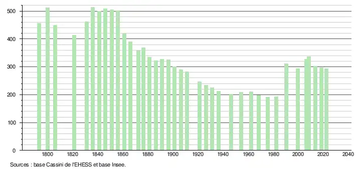 L'évolution du nombre d'habitants est connue à travers les recensements de la population effectués dans la commune depuis 1793. Pour les communes de moins de 10 000 habitants, une enquête de recensement portant sur toute la population est réalisée tous les cinq ans, les populations de référence des années intermédiaires étant quant à elles estimées par interpolation ou extrapolation[27]. Pour la commune, le premier recensement exhaustif entrant dans le cadre du nouveau dispositif a été réalisé en 2008[28].