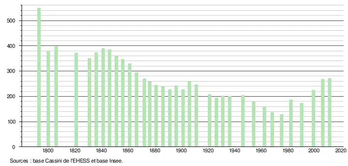 - ↑ Par convention dans Wikipédia, le principe a été retenu de n’afficher dans le tableau des recensements et le graphique, pour les populations légales postérieures à 1999, que les populations correspondant à une enquête exhaustive de recensement pour les communes de moins de 10 000 habitants, et que les populations des années 2006, 2011, 2016, etc. pour les communes de plus de 10 000 habitants, ainsi que la dernière population légale publiée par l’Insee pour l'ensemble des communes.