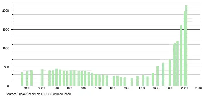 L'évolution du nombre d'habitants est connue à travers les recensements de la population effectués dans la commune depuis 1793. Pour les communes de moins de 10 000 habitants, une enquête de recensement portant sur toute la population est réalisée tous les cinq ans, les populations de référence des années intermédiaires étant quant à elles estimées par interpolation ou extrapolation[17]. Pour la commune, le premier recensement exhaustif entrant dans le cadre du nouveau dispositif a été réalisé en 2005[18].