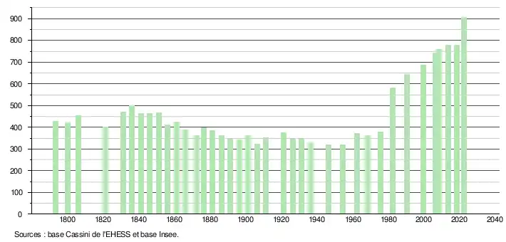 L'évolution du nombre d'habitants est connue à travers les recensements de la population effectués dans la commune depuis 1793. Pour les communes de moins de 10 000 habitants, une enquête de recensement portant sur toute la population est réalisée tous les cinq ans, les populations de référence des années intermédiaires étant quant à elles estimées par interpolation ou extrapolation[24]. Pour la commune, le premier recensement exhaustif entrant dans le cadre du nouveau dispositif a été réalisé en 2008[25].