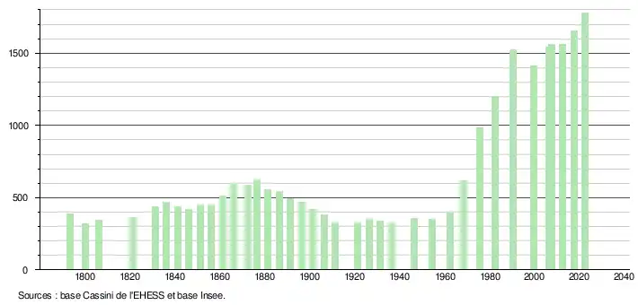 L'évolution du nombre d'habitants est connue à travers les recensements de la population effectués dans la commune depuis 1793. Pour les communes de moins de 10 000 habitants, une enquête de recensement portant sur toute la population est réalisée tous les cinq ans, les populations de référence des années intermédiaires étant quant à elles estimées par interpolation ou extrapolation[21]. Pour la commune, le premier recensement exhaustif entrant dans le cadre du nouveau dispositif a été réalisé en 2007[22].