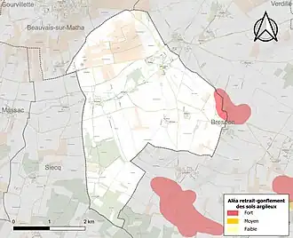 Le retrait-gonflement des sols argileux est susceptible d'engendrer des dommages importants aux bâtiments en cas d’alternance de périodes de sécheresse et de pluie. 1,1 % de la superficie communale est en aléa moyen ou fort (54,2 % au niveau départemental et 48,5 % au niveau national). Sur les 87 bâtiments dénombrés sur la commune en 2019, 5 sont en aléa moyen ou fort, soit 6 %, à comparer aux 57 % au niveau départemental et 54 % au niveau national. Une cartographie de l'exposition du territoire national au retrait gonflement des sols argileux est disponible sur le site du BRGM[12],[Carte 2].