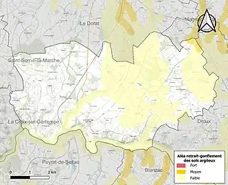 Le retrait-gonflement des sols argileux est susceptible d'engendrer des dommages importants aux bâtiments en cas d’alternance de périodes de sécheresse et de pluie[16]. 0,6 % de la superficie communale est en aléa moyen ou fort (27 % au niveau départemental et 48,5 % au niveau national métropolitain)[Carte 2]. Depuis le , en application de la loi ÉLAN, différentes contraintes s'imposent aux vendeurs, maîtres d'ouvrages ou constructeurs de biens situés dans une zone classée en aléa moyen ou fort[Note 2],[17].