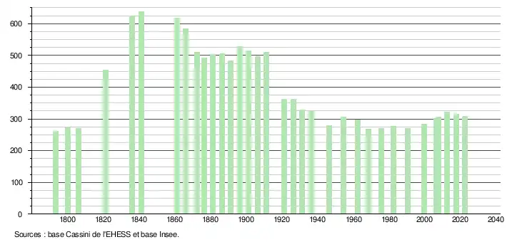 L'évolution du nombre d'habitants est connue à travers les recensements de la population effectués dans la commune depuis 1793. Pour les communes de moins de 10 000 habitants, une enquête de recensement portant sur toute la population est réalisée tous les cinq ans, les populations de référence des années intermédiaires étant quant à elles estimées par interpolation ou extrapolation[19]. Pour la commune, le premier recensement exhaustif entrant dans le cadre du nouveau dispositif a été réalisé en 2007[20].