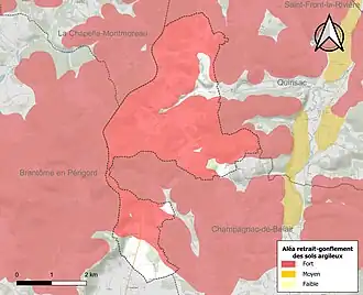 Les mouvements de terrains susceptibles de se produire sur la commune sont des tassements différentiels[34]. Le retrait-gonflement des sols argileux est susceptible d'engendrer des dommages importants aux bâtiments en cas d’alternance de périodes de sécheresse et de pluie[35]. 84,9 % de la superficie communale est en aléa moyen ou fort (58,6 % au niveau départemental et 48,5 % au niveau national métropolitain)[Carte 4]. Depuis le , en application de la loi ÉLAN, différentes contraintes s'imposent aux vendeurs, maîtres d'ouvrages ou constructeurs de biens situés dans une zone classée en aléa moyen ou fort[Note 3],[36].