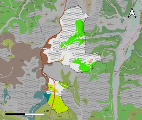 L'occupation des sols de la commune, telle qu'elle ressort de la base de données européenne d’occupation biophysique des sols Corine Land Cover (CLC), est marquée par l'importance des forêts et milieux semi-naturels (53,6 % en 2018), une proportion sensiblement équivalente à celle de 1990 (54,2 %). La répartition détaillée en 2018 est la suivante : forêts (53,6 %), zones agricoles hétérogènes (35,4 %), terres arables (7,1 %), prairies (3,9 %)[28]. L'évolution de l’occupation des sols de la commune et de ses infrastructures peut être observée sur les différentes représentations cartographiques du territoire : la carte de Cassini (XVIIIe siècle), la carte d'état-major (1820-1866) et les cartes ou photos aériennes de l'IGN pour la période actuelle (1950 à aujourd'hui)[Carte 3].