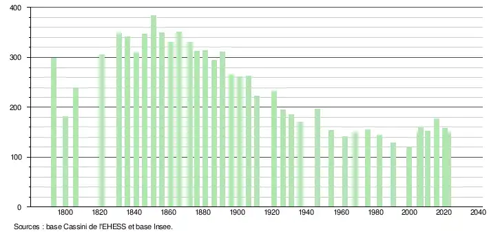 L'évolution du nombre d'habitants est connue à travers les recensements de la population effectués dans la commune depuis 1793. Pour les communes de moins de 10 000 habitants, une enquête de recensement portant sur toute la population est réalisée tous les cinq ans, les populations de référence des années intermédiaires étant quant à elles estimées par interpolation ou extrapolation[49]. Pour la commune, le premier recensement exhaustif entrant dans le cadre du nouveau dispositif a été réalisé en 2005[50].