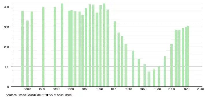L'évolution du nombre d'habitants est connue à travers les recensements de la population effectués dans la commune depuis 1793. Pour les communes de moins de 10 000 habitants, une enquête de recensement portant sur toute la population est réalisée tous les cinq ans, les populations de référence des années intermédiaires étant quant à elles estimées par interpolation ou extrapolation[12]. Pour la commune, le premier recensement exhaustif entrant dans le cadre du nouveau dispositif a été réalisé en 2005[13].