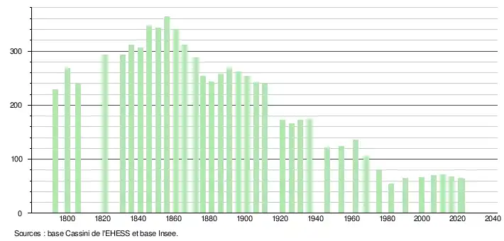 L'évolution du nombre d'habitants est connue à travers les recensements de la population effectués dans la commune depuis 1793. Pour les communes de moins de 10 000 habitants, une enquête de recensement portant sur toute la population est réalisée tous les cinq ans, les populations de référence des années intermédiaires étant quant à elles estimées par interpolation ou extrapolation[20]. Pour la commune, le premier recensement exhaustif entrant dans le cadre du nouveau dispositif a été réalisé en 2006[21].