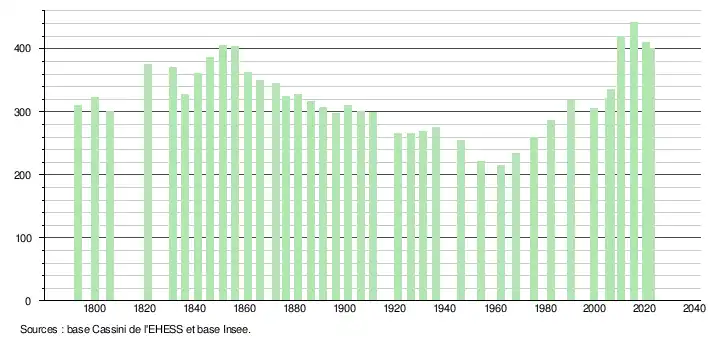 L'évolution du nombre d'habitants est connue à travers les recensements de la population effectués dans la commune depuis 1793. Pour les communes de moins de 10 000 habitants, une enquête de recensement portant sur toute la population est réalisée tous les cinq ans, les populations de référence des années intermédiaires étant quant à elles estimées par interpolation ou extrapolation[15]. Pour la commune, le premier recensement exhaustif entrant dans le cadre du nouveau dispositif a été réalisé en 2005[16].
