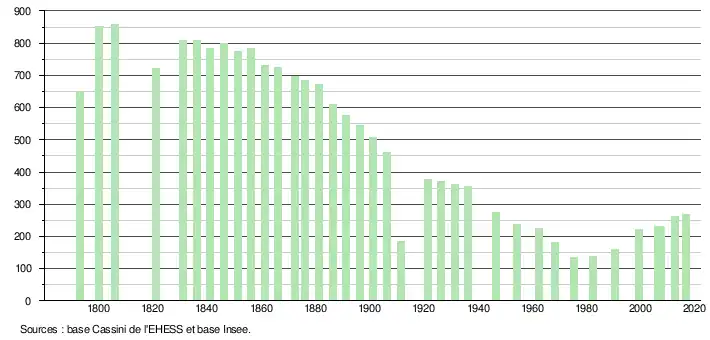 L'évolution du nombre d'habitants est connue à travers les recensements de la population effectués dans la commune depuis 1793. Pour les communes de moins de 10 000 habitants, une enquête de recensement portant sur toute la population est réalisée tous les cinq ans, les populations de référence des années intermédiaires étant quant à elles estimées par interpolation ou extrapolation[6]. Pour la commune, le premier recensement exhaustif entrant dans le cadre du nouveau dispositif a été réalisé en 2007[7].