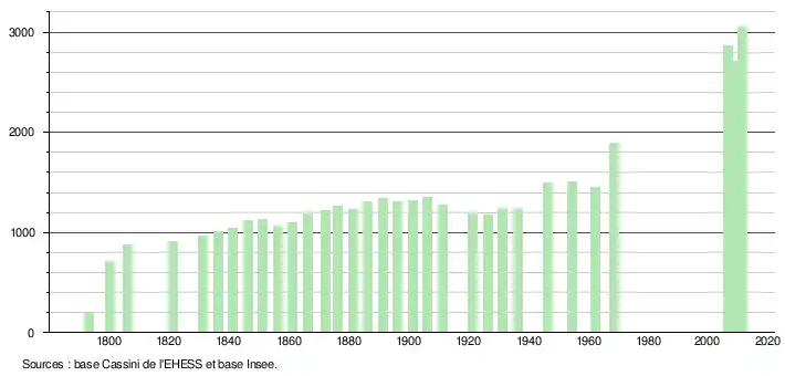 L'évolution du nombre d'habitants est connue à travers les recensements de la population effectués dans la commune depuis 1793. Pour les communes de moins de 10 000 habitants, une enquête de recensement portant sur toute la population est réalisée tous les cinq ans, les populations de référence des années intermédiaires étant quant à elles estimées par interpolation ou extrapolation[7]. Pour la commune, le premier recensement exhaustif entrant dans le cadre du nouveau dispositif a été réalisé en 2004[8].