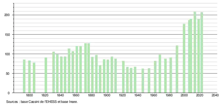 L'évolution du nombre d'habitants est connue à travers les recensements de la population effectués dans la commune depuis 1793. Pour les communes de moins de 10 000 habitants, une enquête de recensement portant sur toute la population est réalisée tous les cinq ans, les populations de référence des années intermédiaires étant quant à elles estimées par interpolation ou extrapolation[25]. Pour la commune, le premier recensement exhaustif entrant dans le cadre du nouveau dispositif a été réalisé en 2008[26].