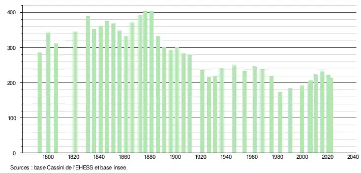 L'évolution du nombre d'habitants est connue à travers les recensements de la population effectués dans la commune depuis 1793. Pour les communes de moins de 10 000 habitants, une enquête de recensement portant sur toute la population est réalisée tous les cinq ans, les populations de référence des années intermédiaires étant quant à elles estimées par interpolation ou extrapolation[19]. Pour la commune, le premier recensement exhaustif entrant dans le cadre du nouveau dispositif a été réalisé en 2005[20].