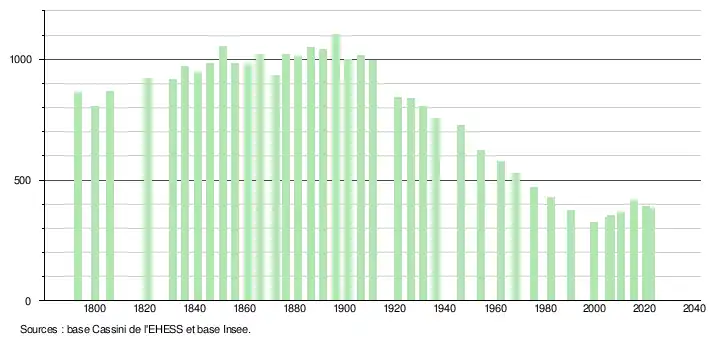 L'évolution du nombre d'habitants est connue à travers les recensements de la population effectués dans la commune depuis 1793. Pour les communes de moins de 10 000 habitants, une enquête de recensement portant sur toute la population est réalisée tous les cinq ans, les populations de référence des années intermédiaires étant quant à elles estimées par interpolation ou extrapolation[15]. Pour la commune, le premier recensement exhaustif entrant dans le cadre du nouveau dispositif a été réalisé en 2005[16].