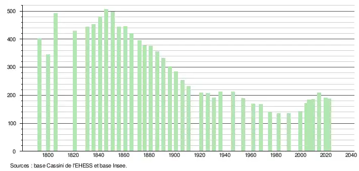 L'évolution du nombre d'habitants est connue à travers les recensements de la population effectués dans la commune depuis 1793. Pour les communes de moins de 10 000 habitants, une enquête de recensement portant sur toute la population est réalisée tous les cinq ans, les populations de référence des années intermédiaires étant quant à elles estimées par interpolation ou extrapolation[48]. Pour la commune, le premier recensement exhaustif entrant dans le cadre du nouveau dispositif a été réalisé en 2004[49].