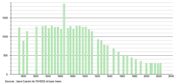 L'évolution du nombre d'habitants est connue à travers les recensements de la population effectués dans la commune depuis 1793. Pour les communes de moins de 10 000 habitants, une enquête de recensement portant sur toute la population est réalisée tous les cinq ans, les populations de référence des années intermédiaires étant quant à elles estimées par interpolation ou extrapolation[21]. Pour la commune, le premier recensement exhaustif entrant dans le cadre du nouveau dispositif a été réalisé en 2008[22].