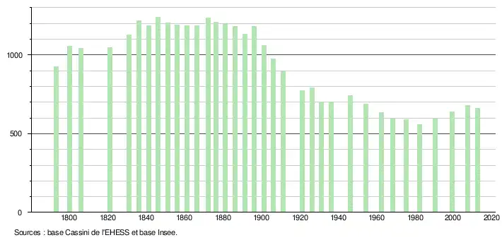 L'évolution du nombre d'habitants est connue à travers les recensements de la population effectués dans la commune depuis 1793. À partir du , les populations légales des communes sont publiées annuellement dans le cadre d'un recensement qui repose désormais sur une collecte d'information annuelle, concernant successivement tous les territoires communaux au cours d'une période de cinq ans. Pour les communes de moins de 10 000 habitants, une enquête de recensement portant sur toute la population est réalisée tous les cinq ans, les populations légales des années intermédiaires étant quant à elles estimées par interpolation ou extrapolation[7]. Pour la commune, le premier recensement exhaustif entrant dans le cadre du nouveau dispositif a été réalisé en 2007[8],[Note 1].