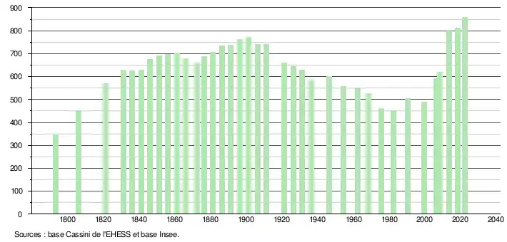 L'évolution du nombre d'habitants est connue à travers les recensements de la population effectués dans la commune depuis 1793. Pour les communes de moins de 10 000 habitants, une enquête de recensement portant sur toute la population est réalisée tous les cinq ans, les populations de référence des années intermédiaires étant quant à elles estimées par interpolation ou extrapolation[15]. Pour la commune, le premier recensement exhaustif entrant dans le cadre du nouveau dispositif a été réalisé en 2008[16].