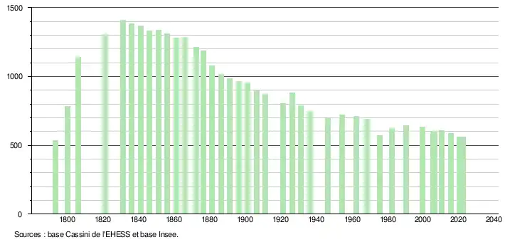 L'évolution du nombre d'habitants est connue à travers les recensements de la population effectués dans la commune depuis 1793. Pour les communes de moins de 10 000 habitants, une enquête de recensement portant sur toute la population est réalisée tous les cinq ans, les populations de référence des années intermédiaires étant quant à elles estimées par interpolation ou extrapolation[26]. Pour la commune, le premier recensement exhaustif entrant dans le cadre du nouveau dispositif a été réalisé en 2005[27].