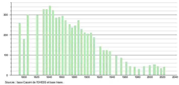 L'évolution du nombre d'habitants est connue à travers les recensements de la population effectués dans la commune depuis 1793. Pour les communes de moins de 10 000 habitants, une enquête de recensement portant sur toute la population est réalisée tous les cinq ans, les populations de référence des années intermédiaires étant quant à elles estimées par interpolation ou extrapolation[30]. Pour la commune, le premier recensement exhaustif entrant dans le cadre du nouveau dispositif a été réalisé en 2007[31].