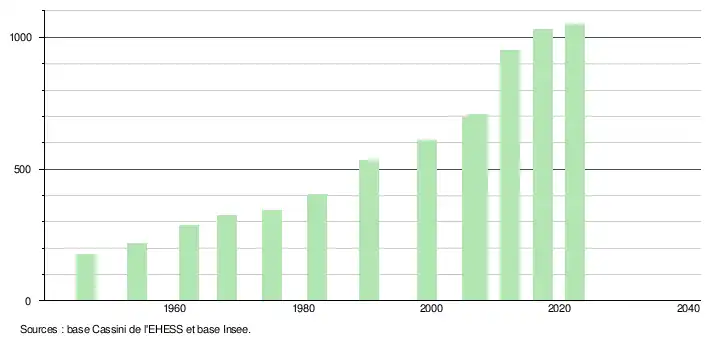 L'évolution du nombre d'habitants est connue à travers les recensements de la population effectués dans la commune depuis 1946. Pour les communes de moins de 10 000 habitants, une enquête de recensement portant sur toute la population est réalisée tous les cinq ans, les populations de référence des années intermédiaires étant quant à elles estimées par interpolation ou extrapolation[18]. Pour la commune, le premier recensement exhaustif entrant dans le cadre du nouveau dispositif a été réalisé en 2007[19].