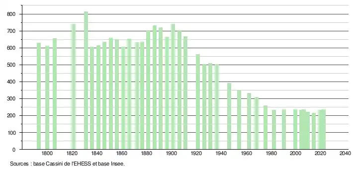 L'évolution du nombre d'habitants est connue à travers les recensements de la population effectués dans la commune depuis 1793. Pour les communes de moins de 10 000 habitants, une enquête de recensement portant sur toute la population est réalisée tous les cinq ans, les populations de référence des années intermédiaires étant quant à elles estimées par interpolation ou extrapolation[21]. Pour la commune, le premier recensement exhaustif entrant dans le cadre du nouveau dispositif a été réalisé en 2004[22].