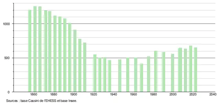 L'évolution du nombre d'habitants est connue à travers les recensements de la population effectués dans la commune depuis 1856. Pour les communes de moins de 10 000 habitants, une enquête de recensement portant sur toute la population est réalisée tous les cinq ans, les populations de référence des années intermédiaires étant quant à elles estimées par interpolation ou extrapolation[30]. Pour la commune, le premier recensement exhaustif entrant dans le cadre du nouveau dispositif a été réalisé en 2007[31].