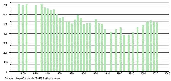 L'évolution du nombre d'habitants est connue à travers les recensements de la population effectués dans la commune depuis 1793. Pour les communes de moins de 10 000 habitants, une enquête de recensement portant sur toute la population est réalisée tous les cinq ans, les populations de référence des années intermédiaires étant quant à elles estimées par interpolation ou extrapolation[25]. Pour la commune, le premier recensement exhaustif entrant dans le cadre du nouveau dispositif a été réalisé en 2007[26].