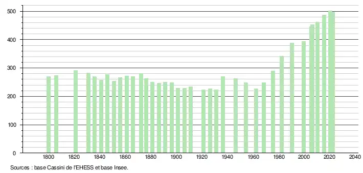 L'évolution du nombre d'habitants est connue à travers les recensements de la population effectués dans la commune depuis 1800. Pour les communes de moins de 10 000 habitants, une enquête de recensement portant sur toute la population est réalisée tous les cinq ans, les populations de référence des années intermédiaires étant quant à elles estimées par interpolation ou extrapolation[24]. Pour la commune, le premier recensement exhaustif entrant dans le cadre du nouveau dispositif a été réalisé en 2005[25].