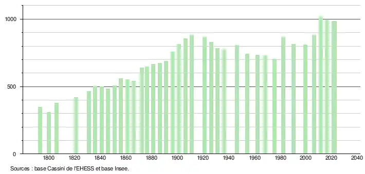 L'évolution du nombre d'habitants est connue à travers les recensements de la population effectués dans la commune depuis 1793. Pour les communes de moins de 10 000 habitants, une enquête de recensement portant sur toute la population est réalisée tous les cinq ans, les populations de référence des années intermédiaires étant quant à elles estimées par interpolation ou extrapolation[61]. Pour la commune, le premier recensement exhaustif entrant dans le cadre du nouveau dispositif a été réalisé en 2006[62].