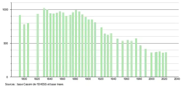 L'évolution du nombre d'habitants est connue à travers les recensements de la population effectués dans la commune depuis 1793. Pour les communes de moins de 10 000 habitants, une enquête de recensement portant sur toute la population est réalisée tous les cinq ans, les populations de référence des années intermédiaires étant quant à elles estimées par interpolation ou extrapolation[15]. Pour la commune, le premier recensement exhaustif entrant dans le cadre du nouveau dispositif a été réalisé en 2007[16].