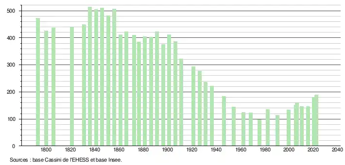 L'évolution du nombre d'habitants est connue à travers les recensements de la population effectués dans la commune depuis 1793. Pour les communes de moins de 10 000 habitants, une enquête de recensement portant sur toute la population est réalisée tous les cinq ans, les populations de référence des années intermédiaires étant quant à elles estimées par interpolation ou extrapolation[18]. Pour la commune, le premier recensement exhaustif entrant dans le cadre du nouveau dispositif a été réalisé en 2005[19].