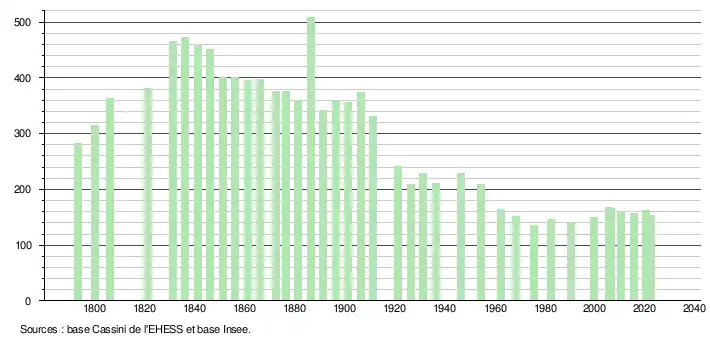 L'évolution du nombre d'habitants est connue à travers les recensements de la population effectués dans la commune depuis 1793. Pour les communes de moins de 10 000 habitants, une enquête de recensement portant sur toute la population est réalisée tous les cinq ans, les populations de référence des années intermédiaires étant quant à elles estimées par interpolation ou extrapolation[15]. Pour la commune, le premier recensement exhaustif entrant dans le cadre du nouveau dispositif a été réalisé en 2005[16].
