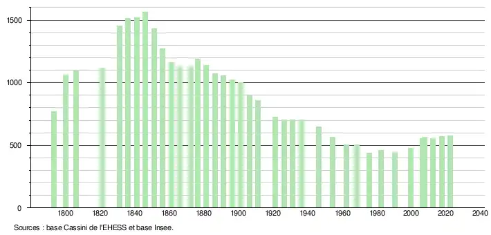 L'évolution du nombre d'habitants est connue à travers les recensements de la population effectués dans la commune depuis 1793. Pour les communes de moins de 10 000 habitants, une enquête de recensement portant sur toute la population est réalisée tous les cinq ans, les populations de référence des années intermédiaires étant quant à elles estimées par interpolation ou extrapolation[22]. Pour la commune, le premier recensement exhaustif entrant dans le cadre du nouveau dispositif a été réalisé en 2007[23].