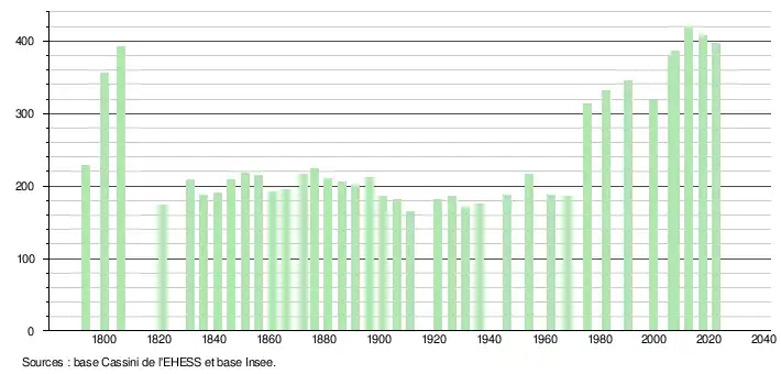L'évolution du nombre d'habitants est connue à travers les recensements de la population effectués dans la commune depuis 1793. Pour les communes de moins de 10 000 habitants, une enquête de recensement portant sur toute la population est réalisée tous les cinq ans, les populations de référence des années intermédiaires étant quant à elles estimées par interpolation ou extrapolation[34]. Pour la commune, le premier recensement exhaustif entrant dans le cadre du nouveau dispositif a été réalisé en 2007[35].