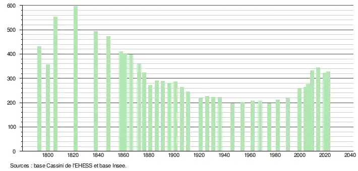 L'évolution du nombre d'habitants est connue à travers les recensements de la population effectués dans la commune depuis 1793. Pour les communes de moins de 10 000 habitants, une enquête de recensement portant sur toute la population est réalisée tous les cinq ans, les populations de référence des années intermédiaires étant quant à elles estimées par interpolation ou extrapolation[12]. Pour la commune, le premier recensement exhaustif entrant dans le cadre du nouveau dispositif a été réalisé en 2004[13].