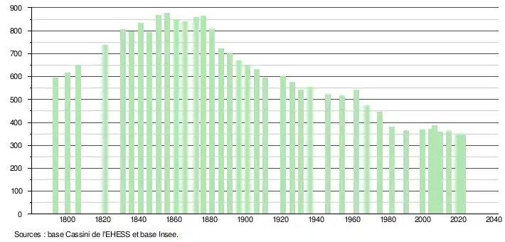 L'évolution du nombre d'habitants est connue à travers les recensements de la population effectués dans la commune depuis 1793. Pour les communes de moins de 10 000 habitants, une enquête de recensement portant sur toute la population est réalisée tous les cinq ans, les populations de référence des années intermédiaires étant quant à elles estimées par interpolation ou extrapolation[15]. Pour la commune, le premier recensement exhaustif entrant dans le cadre du nouveau dispositif a été réalisé en 2004[16].