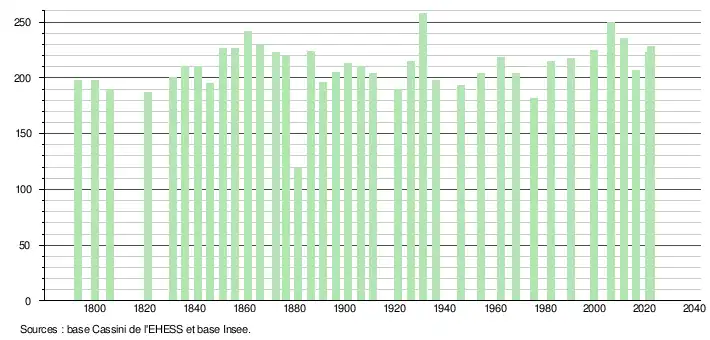 L'évolution du nombre d'habitants est connue à travers les recensements de la population effectués dans la commune depuis 1793. Pour les communes de moins de 10 000 habitants, une enquête de recensement portant sur toute la population est réalisée tous les cinq ans, les populations de référence des années intermédiaires étant quant à elles estimées par interpolation ou extrapolation[15]. Pour la commune, le premier recensement exhaustif entrant dans le cadre du nouveau dispositif a été réalisé en 2006[16].