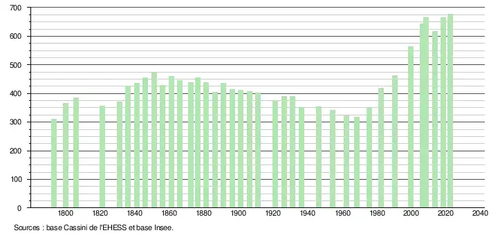 L'évolution du nombre d'habitants est connue à travers les recensements de la population effectués dans la commune depuis 1793. Pour les communes de moins de 10 000 habitants, une enquête de recensement portant sur toute la population est réalisée tous les cinq ans, les populations de référence des années intermédiaires étant quant à elles estimées par interpolation ou extrapolation[42]. Pour la commune, le premier recensement exhaustif entrant dans le cadre du nouveau dispositif a été réalisé en 2008[43].