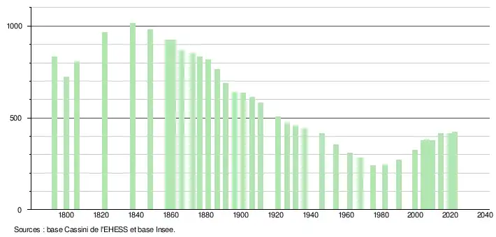 L'évolution du nombre d'habitants est connue à travers les recensements de la population effectués dans la commune depuis 1793. Pour les communes de moins de 10 000 habitants, une enquête de recensement portant sur toute la population est réalisée tous les cinq ans, les populations de référence des années intermédiaires étant quant à elles estimées par interpolation ou extrapolation[15]. Pour la commune, le premier recensement exhaustif entrant dans le cadre du nouveau dispositif a été réalisé en 2004[16].
