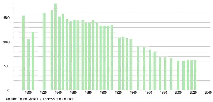 | L'évolution du nombre d'habitants est connue à travers les recensements de la population effectués dans la commune depuis 1793. Pour les communes de moins de 10 000 habitants, une enquête de recensement portant sur toute la population est réalisée tous les cinq ans, les populations de référence des années intermédiaires étant quant à elles estimées par interpolation ou extrapolation[38]. Pour la commune, le premier recensement exhaustif entrant dans le cadre du nouveau dispositif a été réalisé en 2007[39]. En 2022, la commune comptait 617 habitants[Note 6], en évolution de −1,28 % par rapport à 2016 (Tarn : +2,52 %, France hors Mayotte : +2,11 %). |