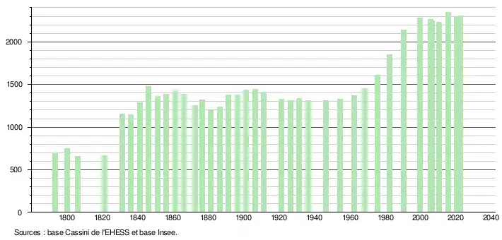 L'évolution du nombre d'habitants est connue à travers les recensements de la population effectués dans la commune depuis 1793. Pour les communes de moins de 10 000 habitants, une enquête de recensement portant sur toute la population est réalisée tous les cinq ans, les populations de référence des années intermédiaires étant quant à elles estimées par interpolation ou extrapolation[28]. Pour la commune, le premier recensement exhaustif entrant dans le cadre du nouveau dispositif a été réalisé en 2005[29].