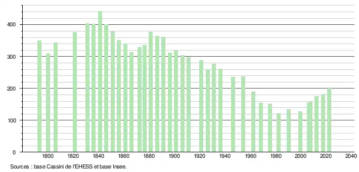 L'évolution du nombre d'habitants est connue à travers les recensements de la population effectués dans la commune depuis 1793. Pour les communes de moins de 10 000 habitants, une enquête de recensement portant sur toute la population est réalisée tous les cinq ans, les populations de référence des années intermédiaires étant quant à elles estimées par interpolation ou extrapolation[28]. Pour la commune, le premier recensement exhaustif entrant dans le cadre du nouveau dispositif a été réalisé en 2007[29].