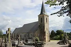 L'église, qui dépend du diocèse de Bayeux-Lisieux, a été principalement construite au XIIIe siècle, sous le patronage du prieur de Sainte-Barbe-en-Auge[61]. Elle reprend toutefois un bâti plus ancien, remontant au XIIe ou XIIe siècle, et qui constitue le mur nord de la nef. L'édifice comprend un clocher-porche, une nef et un chœur de trois travées.