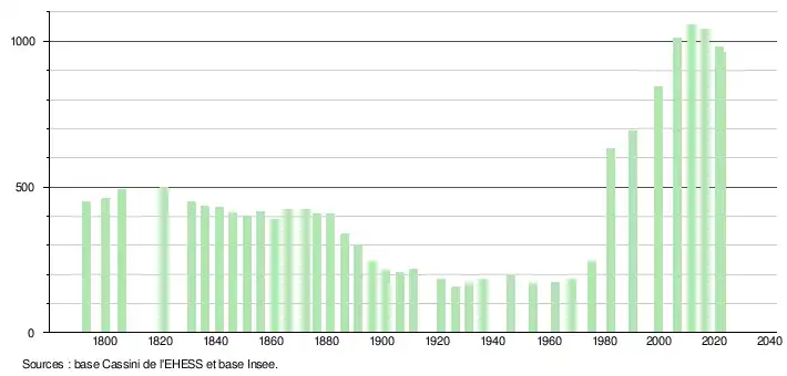 L'évolution du nombre d'habitants est connue à travers les recensements de la population effectués dans la commune depuis 1793. Pour les communes de moins de 10 000 habitants, une enquête de recensement portant sur toute la population est réalisée tous les cinq ans, les populations de référence des années intermédiaires étant quant à elles estimées par interpolation ou extrapolation[41]. Pour la commune, le premier recensement exhaustif entrant dans le cadre du nouveau dispositif a été réalisé en 2006[42].