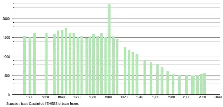 L'évolution du nombre d'habitants est connue à travers les recensements de la population effectués dans la commune depuis 1793. Pour les communes de moins de 10 000 habitants, une enquête de recensement portant sur toute la population est réalisée tous les cinq ans, les populations de référence des années intermédiaires étant quant à elles estimées par interpolation ou extrapolation[17]. Pour la commune, le premier recensement exhaustif entrant dans le cadre du nouveau dispositif a été réalisé en 2008[18].