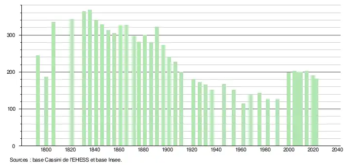 L'évolution du nombre d'habitants est connue à travers les recensements de la population effectués dans la commune depuis 1793. Pour les communes de moins de 10 000 habitants, une enquête de recensement portant sur toute la population est réalisée tous les cinq ans, les populations de référence des années intermédiaires étant quant à elles estimées par interpolation ou extrapolation[25]. Pour la commune, le premier recensement exhaustif entrant dans le cadre du nouveau dispositif a été réalisé en 2004[26].